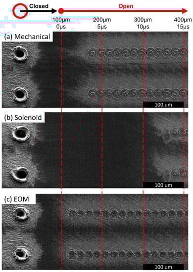 The practical opening time of each different shutter type was next tested using a laser micromachining experiment. As shown by the illustration at the top of Figure 5, a hole was first drilled on the left side of the sample. Next, the shutter was closed, and the beam position began shifting with a translational velocity of 20 mm/s towards the right. Finally, after 5 ms (at a distance of exactly 100 µm), the shutter was signaled to open while the beam continued to shift across the surface. This test was repeated eight times for each shutter. Based on this simple experiment, the practical opening time can be elucidated in Figure 5 from the distance between the large hole on the left and the first discernible ablated spot to the right. For example, in the case of the mechanical shutter we observe an average distance of 170.5 ± 4.4 µm, corresponding to a practical opening time of 3.03 ± 0.22 ms. For the solenoid shutter, we find that topen = 12.20 ± 0.29 ms, and for the EOM shutter we find that topen = 0.62 ± 0.22 ms.