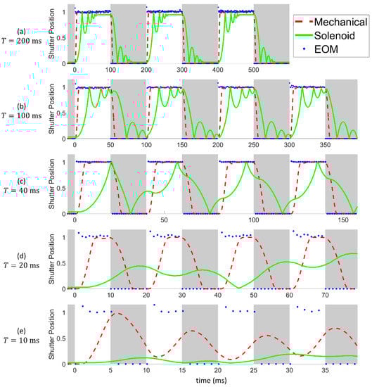 Figure 6d,e presents our observations for T = 20 and 10 ms. At these very fast cycling times, the solenoid shutter no longer functions at all, reaching shutter positions no greater than 0.22 in the graph. At such low shutter positions, the edge of the shutter’s blade does not move far enough for even the periphery of the laser beam to pass. From a practical perspective, the solenoid shutter remains closed throughout the entire experiment. The mechanical shutter still performs relatively well at T = 20 ms, faithfully following the command signal with only a short lag time of 3 ms. However, at P = 10 ms (Figure 6e), this shutter finally fails. This failure was expected at this cycling period since the manufacturer states that the shutter has an opening time of 3–6 ms, and hence a cycling time of 6–12 ms, which matches the duration of the signal tested. In contrast, the EOM shutter continues to perform nearly perfectly throughout every cycling period tested. Even at a cycling period of only T = 10 ms, the EOM shutter is almost always in the correct open/closed position. Only a few datapoints represent positional errors wherein the shutter is open during a close command or closed during an open command.
