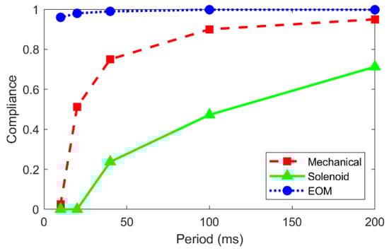 To quantify the performance of the different shutters at various cycling periods, we introduce a new parameter that we call the compliance, C, which is calculated based on the shutter’s position during the open signals sent by the controller. So if the total duration of open signals sent by the controller is given by topen,signal, and the measured time that the shutter is actually open (during the open signal) is topen,meas, then C = topen,meas/topen,signal. Using this definition, the compliance is graphed versus the cycling period in Figure 7. Clearly, each shutter performs best at longer cycling times. For example, at T = 200 ms, the values are CEOM = 1, Cmech = 0.95, and Csol = 0.71, whereas for T = 10 ms, the values are as low as CEOM = 0.96, Cmech = 0.02, and Csol = 0. This graph also serves as a clear visualization that in general, the EOM shutter is the highest performing option, and the solenoid shutter has the worst performance.