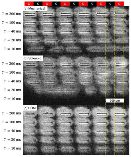 Figure 8 provides a physical demonstration of the conclusions drawn from Figure 6 and Figure 7. For each shutter, a series of horizontal dashes are micromachined at various cycling times. The translation speed used for each line is adjusted such that the length of each dash, and the spaces between them, are intended to be 100 µm (as shown by the yellow lines). Accordingly, dashes at shorter cycling periods are machined at a faster translation speed. The red and black boxes at the top of the figure indicate the horizontal sections in which the shutters should be open (O) and closed (C). These images confirm the trends observed in Figure 7. That is, for long cycling times all three shutter options successfully execute the signal instructions. Additionally, as the cycling period is reduced, the dashes begin to lag behind the signal instructions. The mechanical shutter exhibits noticeable lag times at T = 20 ms and fails completely at T = 10 ms. The solenoid shutter exhibits noticeable lag times throughout the entirety of the experiment and fails completely at T = 20 ms. The EOM shutter performs extremely well at each cycling period tested, only showing noticeable lag behind the command signal when T = 10 ms.