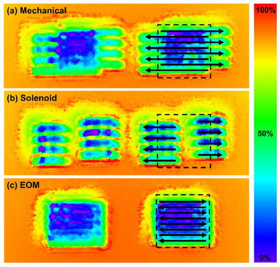 As a final test of each shutter technology considered in this report, we attempted to micromachine an array of 100 × 100 µm2 square holes, spaced 100 µm apart. The beam was raster scanned across the surface with a translation speed of 5 mm/s, corresponding to an open/close time of 20 ms, and hence a cycling period of 40 ms when considering a wide array of inscribed features. Figure 9 displays topographical heat map images of the results, so that the depth of the features can be visualized. Figure 9a shows the features inscribed by the mechanical shutter, which are clearly affected by the lag time of this device. On the right feature, a dashed square box illustrates the intended shape of the square, and the arrows indicate the direction of the raster scanning beam. It is clear that the lag time of the shutter causes each pass of the beam to be displaced slightly from the previous, resulting in misaligned edges of the microstructure. This effect is even more clearly demonstrated by the solenoid shutter (Figure 9b), where subsequent passes of the beam do not overlap at all. The magnitude of this problem can actually be predicted by the solenoid shutter’s measured opening time of 12.20 ms. Considering the translation velocity of 5 mm/s, the opening time of the shutter leads to a displacement of 61 µm in each direction, such that subsequent lines, when the beam is raster scanned left and right, become misaligned by a total of 122 µm—greater than the width of the intended microstructures. Therefore, it is not possible for this shutter to inscribe overlapping lines to develop features smaller than 122 µm.