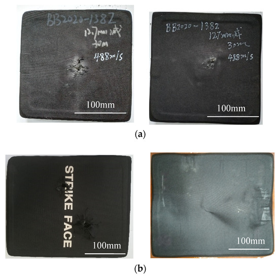 The integral ceramic plates were controlled not to be too large to ensure the uniform quality and performance. Thus, the size of the integral ceramic/UHMWPE armor samples was also smaller (210 mm × 210 mm). In order to avoid size effect, one sample was only hit by one bullet. The spliced ceramic plates were composed of many small hexagonal ceramic sheets; the splicing size was not limited, so that the prepared ceramic/UHMWPE armor samples were also larger in size (400 mm × 250 mm), and one sample could be tested with one bullet or two bullets.
