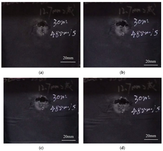 Figure 3 shows some real-time images taken during the compression failure of the ceramic/UHMWPE armor with integral ceramic plate. As shown in Figure 3, within 1 min after loading, the morphology around the bullet hole did not change significantly, but the cracking sound of the ceramic plate was heard, presumed to be the friction sound of residual fragments in the trajectory after bullet impact.