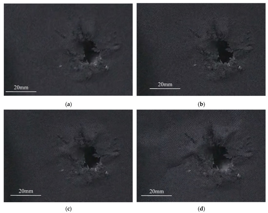 The bullet marks on the front surface of the armors in Figure 1a,b are compared. It is found that there is obvious ceramic debris at the impact point of the integral ceramic plate, and the anti-cracking cloth around the impact point is a little convex. Thus, it can be inferred that the ballistic damage mode of the integral ceramic plates after a bullet impact is mainly ceramic crushing and crack propagation. However, the broken ceramic fragments were separated from the integral plate and stuck together with the anti-cracking cloth, which resulted in some uneven zones and bulges on the surface of the anti-cracking cloth Conversely, there is no obvious ceramic debris at the impact point of the spliced ceramic plate, the anti-cracking cloth around the impact point is flat, and there is only some less obvious indentation on the surface. It is speculated that the damage of the spliced ceramic plate after a bullet impact is mainly due to the dislocation between the small ceramic sheets; the impact force on the impact point spreads to the adjacent ceramic sheets, and the change of their relative position consumes a lot of energy, which reduces the tendency of the ceramic sheets to break. The indentation on the anti-cracking cloth is caused by the change in the relative position between the ceramic sheets.