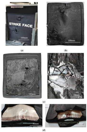 After the anti-cracking cloth layer wrapped around the armor sample was peeled off, the final damage of the ceramic plate and the sandwich structure can be seen as shown in Figure 4c,d. When the anti-cracking cloth was removed, some ceramic fragments stuck to it and were taken away. Therefore, the left of Figure 4c shows the fractured shape of the inner layer of the ceramic plate. After the ceramic fragments were carefully separated from the anti-cracking cloth and replaced on the front surface of the ceramic plate, the damage morphology is restored and is shown in the right of Figure 4c.