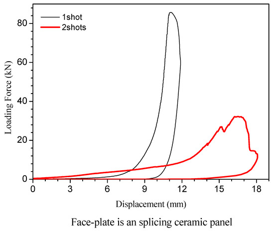 The size of the spliced ceramic plate was large, which made it possible to study the residual strength of the ceramic/UHMWPE armor after multiple strikes. The processing method of data from the compression experiment is the same as above. The load force/displacement curves are shown in Figure 8. They represent the compression test of the spliced ceramic/UHMWPE armor that suffered one or two bullets, respectively.