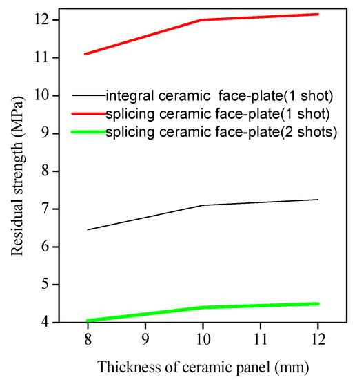 Residual strength is an absolutely competent parameter in the structural safety assessment and life prediction. The remaining bearing capacity of the ceramic/UHMWPE armor after ballistic damage was affected by the configuration, thickness, and damage mode of the ceramic plate. After a single attack with the same working condition, the residual strength of the spliced ceramic/UHMWPE armor was greater than that of the integral ceramic/UHMWPE armor provided that their total thickness and the plate thickness of each layer was the same. Under the same working condition, after two bullets hit, the residual strength of the spliced ceramic/UHMWPE armor decreased rapidly, which was only one-third of that after one bullet hit. Similarly, after one bullet hit, the greater the thickness of the ceramic plate, whether it was integral or spliced, the greater the residual strength of the composite armor. However, as shown in the experimental data shown in Table 1, the relationship between the residual strength and the thickness of the ceramic plate does not increase linearly. When preparing protective armor equipment, the requirements of manufacturing cost, service condition, and protection level can be comprehensively considered to design an appropriate thickness of the ceramic plate.