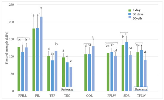 Flexural strength (MPa) of tested materials. Equal letters represent statistically homogeneous groups for a particular time point. Parentheses indicate statistically similar groups for a particular material. Dashed parentheses indicate statistically homogeneous groups within the same material, which are not similar to the column in between (in cases where the time dependence is not monotonous), p < 0.05.