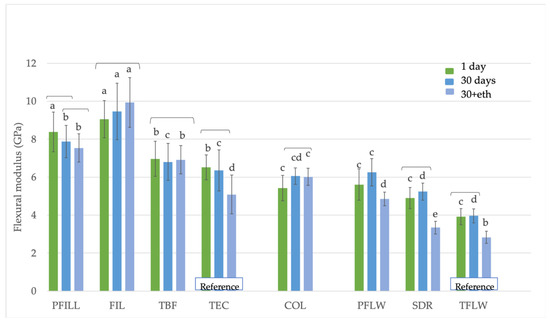 Figure 3 shows the highest values of the flexural modulus for FIL for all three time groups (9.0 ± 0.1 GPa for 1 day, 9.5 ± 1.5 GPa for 30 days, and 9.9 ± 1.3 GPa for 30+eth), which were statistically similar to the PFILL material after 1 day (8.4 ± 1.0 GPa), followed by other high-viscosity materials. Low-viscosity materials showed lower values in the 30+eth group, while high- and medium-viscosity materials did not show modulus degradation when 30-day and 30+eth groups were compared. The low-viscosity conventional reference material TFLW had the lowest flexural modulus (2.8 ± 0.3 GPa for 30+eth). SDR specimens stored in ethanol for 3 days after 30 days in saline had similarly low value (3.3 ± 0.3 GPa).