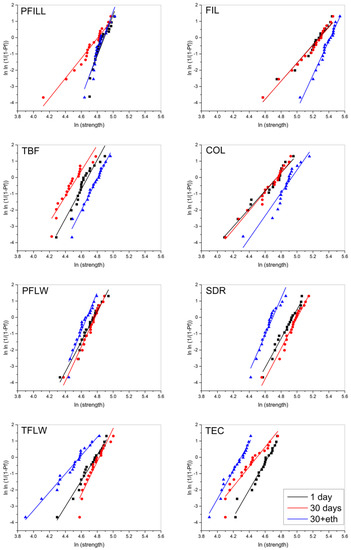 The behavior mentioned above is also demonstrated in the Weibull plots in Figure 4. where high-viscosity bulk-fills had a distinctive shift toward higher values for 30+eth groups (blue line) with high reliability, especially for PFILL. PFLW, on the other hand, was the material with the highest overall reliability for all groups and the narrowest distribution of the results. This can be attributed to the flowable consistency and easy handling in the specimen preparation. This fact is supported by Hayashi et al. [44], who showed that PFLW has a low tendency to form internal defects and voids.