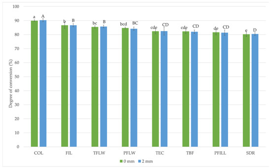Comparison of the degree of conversion values (%) for tested materials. All pairs (0 mm vs. 2 mm) were statistically similar. Lowercase letters indicate statistically homogeneous groups at 0 mm, while uppercase letters indicate homogeneous groups at 2 mm (p < 0.05).