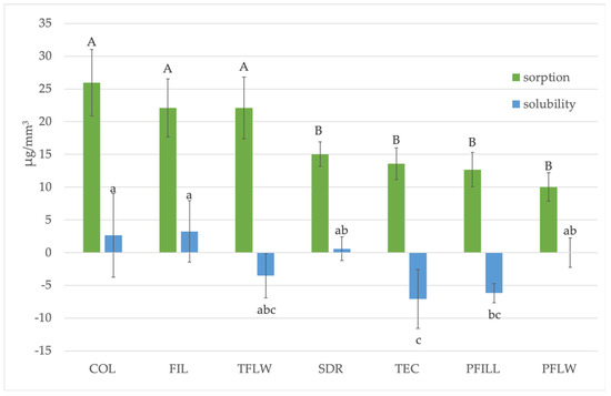 Comparison of water sorption and solubility of tested materials. Uppercase letters indicate statistically similar sorption values, while lowercase letters indicate statistically similar solubility values (p < 0.05).