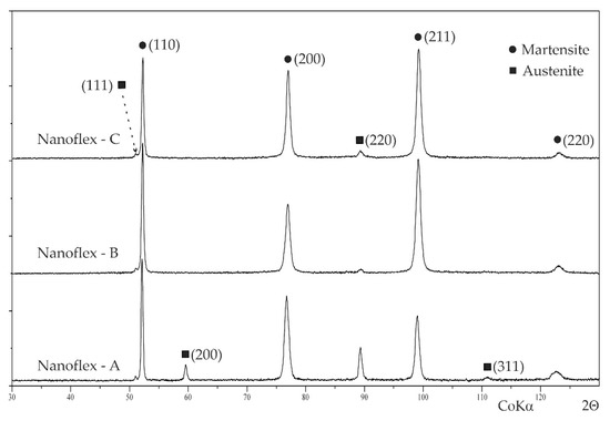 XRD patterns acquired from Nanoflex steel under conditions A, B and C (in an accordance with Table 2) are shown in Figure 1. Generally, all samples, regardless technological conditions, were composed of two major phases, i.e., martensite (b.c.c. structure) and a certain amount of retained austenite (f.c.c. structure). The quantity of retained austenite in the steel under condition A (after solutioning) was significantly greater in comparison with the other conditions due to strain-induced martensitic transformation. For all technological conditions, comparing the intensities of peaks indexed as (110), (200) and (211) for martensite and (111) and (220) for austenite, it can be concluded that the steel had a dominant texture produced by cold working. In the XRD pattern acquired from the steel under condition C (after ageing), no peaks from the strengthening phases (obviously present in the structure [2,3,42]) were visible due to their volume being too low.