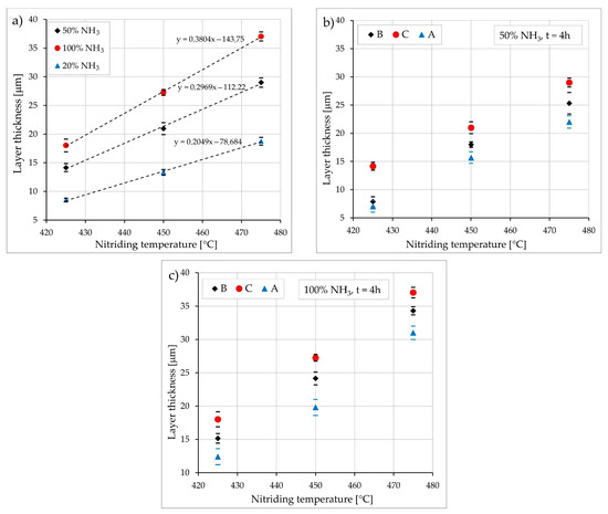Thickness of nitrided layers in the function of nitriding temperature: (a)—Nanoflex steel under condition C; (b) and (c)—Nanoflex steel under conditions A, B and C.