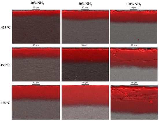 Qualitative distribution of nitrogen (red colour) on cross sections of nitrided layers on Nanoflex steel under condition C with various treatment parameters (treatment time: 4 h). Secondary electron image and WDS X-ray microanalysis.