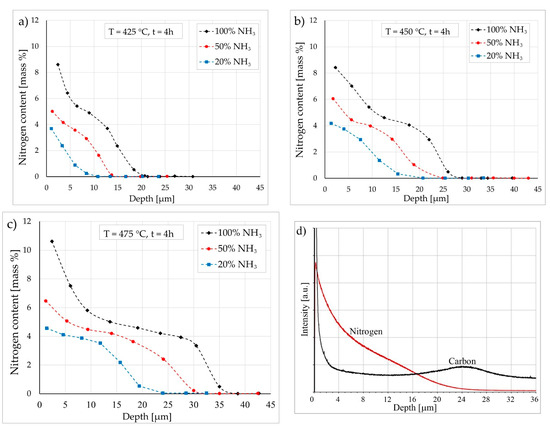 (a–c) Quantitative distribution of nitrogen on cross sections of nitrided layers on Nanoflex steel under condition C with various treatment parameters (treatment time: 4 h), WDS X-ray microanalysis. (d) Qualitative distribution of nitrogen and carbon on cross sections of nitrided layer (450 °C, 50% NH3, 4 h) on Nanoflex steel under condition C, GDOES.