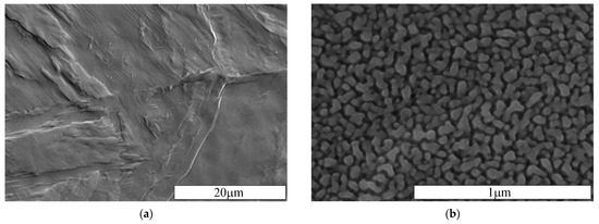 A characteristic surface relief, as shown in Figure 6a, was caused by nitriding, regardless of technological parameters. This relief reflects the needle-like martensitic nature of the steel structure and shows traces of slip bands—twins demonstrating the significant stresses caused by nitriding. An increase in surface roughness was observed, i.e., arithmetical mean deviation of the profile (Ra), after nitriding rose to c.a. 0.25 ± 0.05 µm. This phenomenon is typical for gas low-temperature thermochemical treatment of stainless steels and was also observed by the authors on nitrocarburized austenitic steel [44]. The presence of a sublayer containing nanometric nitrides was confirmed by high-resolution scanning electron microscopy of the surface (Figure 6b). The sublayer was observed for all the layers, including obtained at 425 °C in an atmosphere containing 20% NH3.