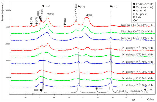 The shape of the diffraction patterns indicates that both expanded austenite (also referred to as S phase) and nitrogen-expanded martensite were present in the structure of the layers and constitute the main phase components. Usually, the intensity is expanded; however, martensite peaks are very low and broad. Thus, the shape of diffraction patterns indicates the presence of severe defects in the crystal structure.