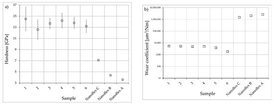 (a) Hardness, (b) wear coefficient of nitrided layers and Nanoflex steel under conditions A, B and C.