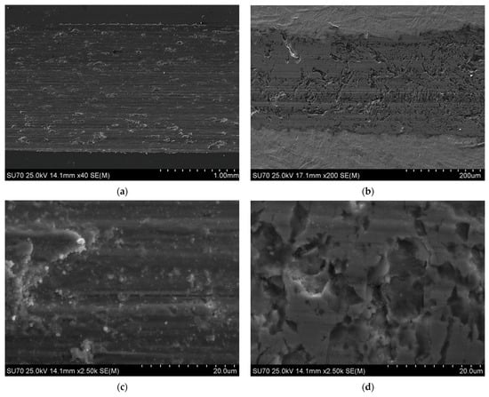 Secondary electron images of the surface of wear tracks after tribological tests of: (a,c) Nanoflex steel in condition C, (b,d) layers nitrided at a temperature 450 °C for 4 h in an atmosphere containing 100% NH3.