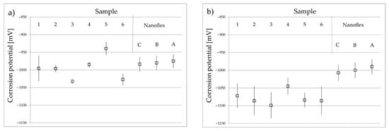 Values of corrosion potentials for nitrided layers and Nanoflex steel under conditions A, B and C. (a) Test in Ringer’s solution, (b) test in 3% NaCl in water.