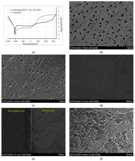 (a) Potentiodynamic polarization graphs (in Ringer’s solution) for Nanoflex steel under condition C and nitrided layer (450 °C, 4 h, 50% NH3); (b–f) secondary electron images of surfaces after potentiodynamic corrosion tests of: (b) Nanoflex steel tested in 3% NaCl in water, (c) Nanoflex steel tested in Ringer’s solution, (d) nitrided layer (450 °C, 4 h, 50% NH3) tested in Ringer’s solution, (e,f) nitrided layer (475 °C, 4 h, 100% NH3) tested in Ringer’s solution.