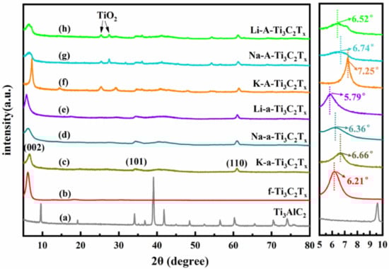 XRD patterns of (a) Ti3AlC2, (b) f-Ti3C2Tx, (c) K-a-Ti3C2Tx, (d) Na-a-Ti3C2Tx, (e) Li-a-Ti3C2Tx, (f) K-A-Ti3C2Tx, (g) Na-A-Ti3C2Tx, and (h) Li-A-Ti3C2Tx. The right side of the figure presents the enlarged XRD pattern with diffraction angle of 5°–10°.