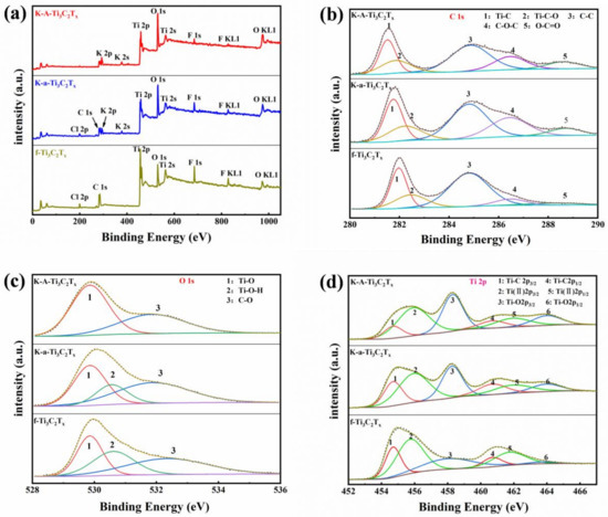 XPS results of f-Ti3C2Tx, K-a-Ti3C2Tx, and K-A-Ti3C2Tx: (a) full spectrum, (b) C 1s spectra, (c) O 1s spectra, and (d) Ti 2p spectra.