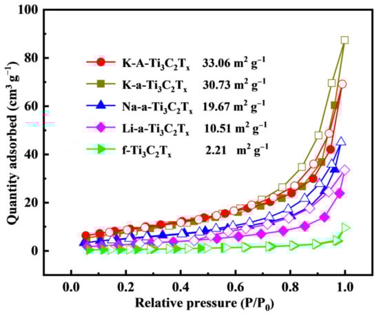 N2 adsorption–desorption isotherms of f-Ti3C2Tx, K-a-Ti3C2Tx, Na-a-Ti3C2Tx, Li-a-Ti3C2Tx, and K-A-Ti3C2Tx.