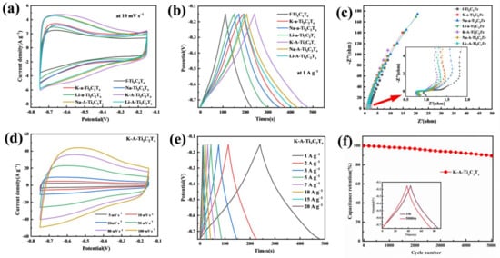 The GCD discharge time is usually used to represent the electrode capacity to store charges at the same current density. Figure 8b shows the GCD curve of all the samples at a current density of 1 A g−1. According to the GCD curves (Figure 8b), K-A-Ti3C2Tx has the longest discharge time, indicating that it has the highest specific capacity. The EIS test was performed on the electrode material. The measured Nyquist curve is shown in Figure 8c. The Nyquist curve mainly includes two parts: the high- and low-frequency areas. The enlarged image of the high-frequency area (Figure 8c) shows that Ti3C2Tx has a smaller semicircle; thus, the charge transfer resistance is small, which contributes to high magnification performance. The curve in the low-frequency region appears as a straight line. Its slope corresponds to the capacitance characteristics of the material, which is related to ion diffusion/transmission and Warburg impedance. The higher is the slope value of the curve, the lower is the diffusion resistance [36]. The straight lines of all the samples are almost perpendicular to the X axis, indicating good capacitance characteristics. The slope of K-A-Ti3C2Tx is the highest, indicating that it has better ion mobility and lower diffusion resistance than the other samples.