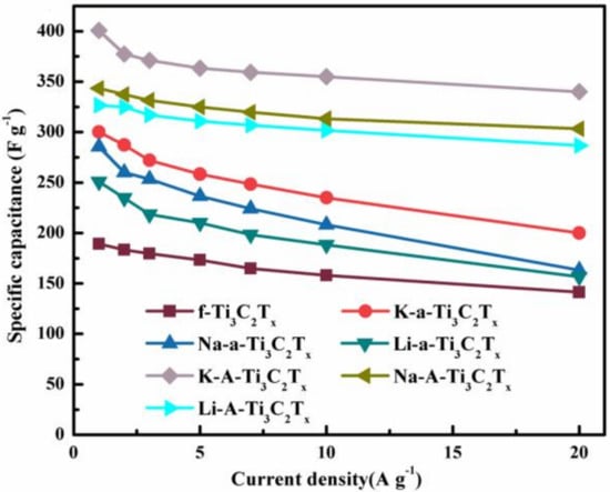 Figure 9 shows the specific capacitance of Ti3C2Tx electrodes at the scan rates of 1–20 A g−1. At the current density of 1 A g−1, the mass specific capacities of f-Ti3C2Tx, K-a-Ti3C2Tx, Na-a-Ti3C2Tx, Li-a-Ti3C2Tx, K-A-Ti3C2Tx, Na-A-Ti3C2Tx, and Li-A- Ti3C2Tx are 228.2, 300.2, 285.7, 250.8, 400.7, 343.3, and 326.7, respectively. The electrochemical performance of K-A-Ti3C2Tx improved substantially. The subsequent annealing treatment further reduced the content of unfavorable surface functional groups, and electrochemical performance was improved. This result is higher than previous report on Ti3C2Tx-based materials, the detailed data are listed in Table 1. The specific capacities of the Ti3C2Tx samples obtained through alkaline flocculation and annealing at different current densities are excellent. With its excellent 3D porous structure, perfect surface cleanliness, and large layer spacing, K-A-Ti3C2Tx shows outstanding electrochemical performance.