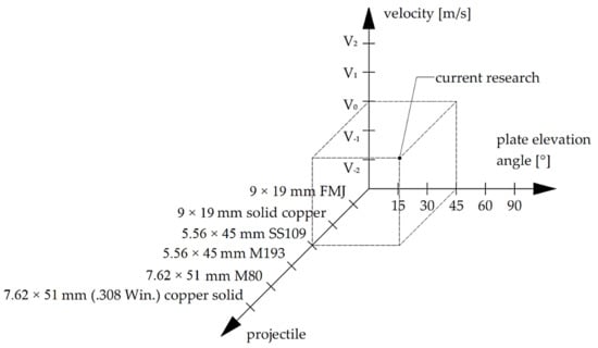 Contrary to the work of [], we decided to support the experimental research with FE analyses. Hence, it would be possible to recognise the phenomenon in more detail and calculate the ricochet temperatures, which will eventually help to determine if ignition of a given substance is possible. FEM is a useful tool, especially as thermal cameras have a large limitation in recording speed.
