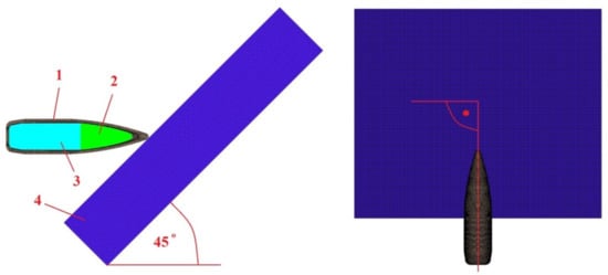 Numerical model of the 5.56 × 45 mm HC (SS109) projectile and Armox 600 plate: 1—tombac jacket, 2—steel core, 3—lead core, 4—Armox 600 armour plate.