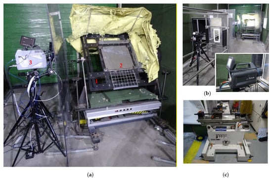 Laboratory stand for measuring temperature of ricocheting projectiles: (a) 1—mounting stand, 2—500 × 500 × 10 mm Armox 600 armour plate, 3—Photron Fastcam SA-Z 2100 K high-speed camera, (b) FLIR X6580sc thermal camera, (c) ballistic mount with 5.56 × 45 mm ballistic barrel.