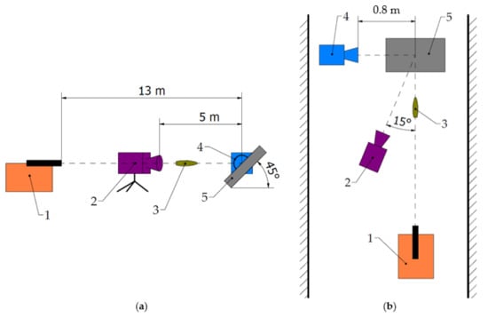 Schematic of the setup: (a) side view; (b) top view; 1—ballistic mount with barrel, 2—thermal camera, 3—projectile, 4—high-speed camera, 5—armour plate.