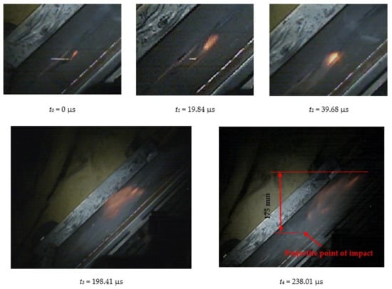 The high-speed camera record (Figure 6) shows distorted proportions of the projectile; it is elongated. This is due to the relatively slow shutter speed; fast objects are then “blurred” but shortening this time would result in a recording that is too dark. In subsequent works, in order to eliminate this phenomenon it is planned to use more lighting, which would allow for a shorter shutter speed. The time for the first frame (t0) is 0 µs, and it is related to the moment of impact of the projectile on the armour plate and the beginning of the phenomena.
