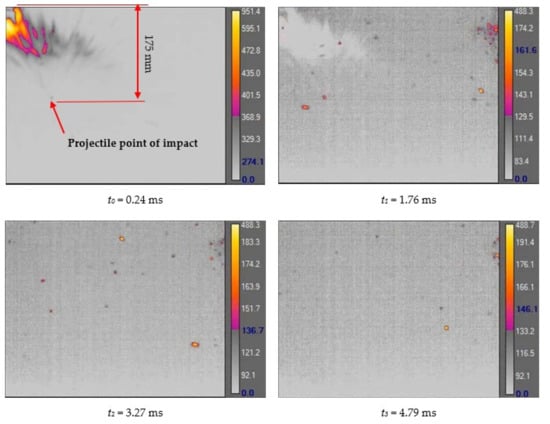 - The maximum recording speed of the thermal camera is relatively low compared to the phenomenon under study. During long time intervals between the recorded frames, the maximum unregistered temperature of fragments may occur. It was recorded at the maximum speed of 660 fps and the time interval between consecutive frames was 1.5 × 10−3 s, while the contact of the projectile with the plate, during which the maximum temperature can be expected, lasts approximately 4 × 10−5 s.