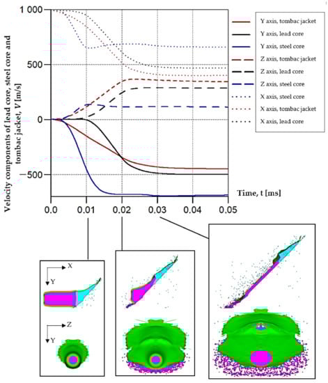 Numerical simulations allow for an analysis of the components of average velocities of the fragments of projectiles along the OX, OY and OZ axes (Figure 8); in case of a high-speed or thermal camera, such analysis would be very difficult and time-consuming. This analysis allows for a better understanding of the phenomenon. The debris has the highest velocity along the OX and OY axes, with the highest values obtained for steel core fragments. The fragments along the OZ axis have the lowest velocity while at the same time the tombac jacket has the greatest velocity on this axis.