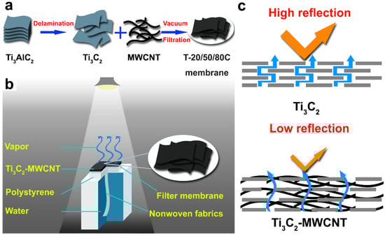 18] composite membranes, respectively. Hence, photothermal membrane with rough surface and porous structure by intercalating various dimensional nanostructures has become a candidate for promoting water transportation and vapor escape. Adding one-dimensional (1D) multi-walled carbon nanotubes (MWCNT) with excellent hydrophilicity and thermal conductivity into the 2D membrane is also considered as an effective strategy for enhancing the porosity, light absorption and thermal conduction to the interfacial water. In this work, the 2D/1D MXene/MWCNT hybrid membrane was fabricated as the solar absorber for enhancing the vapor generation and seawater desalination performance.