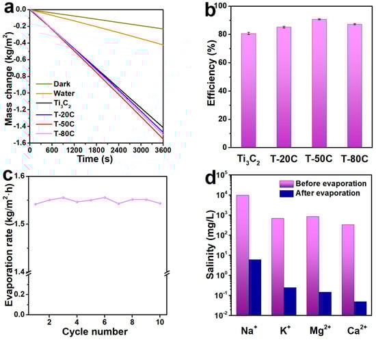 Figure 4c), suggesting the stability of the hybrid membrane. To evaluate the desalination performance of the membrane, the salinity before and after solar evaporation was tracked. The concentration of four primary ions (Na