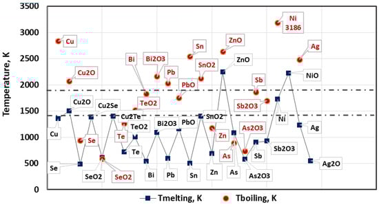 Figure 2 shows the melting and boiling temperatures of studied metals and compounds. The temperature range 1460–1800 K of e-beam melting process is marked in Figure 2 by dashed lines.