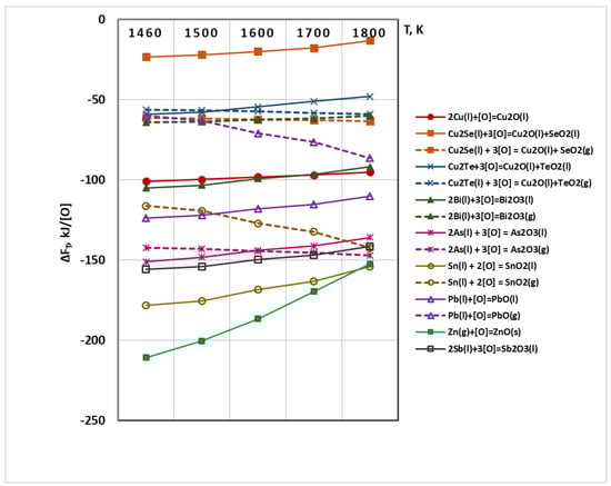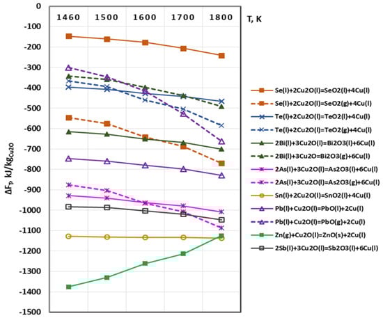 The possibility of chemical interactions between Cu2O(s,l) and metal impurities is described by Equation (3). The calculated values of ΔFT are shown in Figure 4. The calculations at T = 1460 K were performed under the condition that the copper oxide is in a solid state (Cu2O(s)) as the melting temperature of the copper oxide is higher (1508 K).