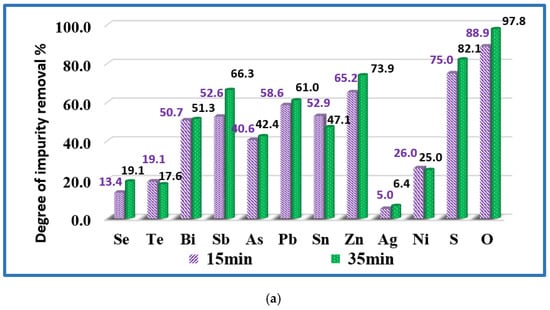 The influence of the refining time on the degree of impurity removal (α) is evaluated for 1500 K and 1700 K and the calculated values are presented in Figure 6. The analysis of the results shows that at both temperatures, extending the refining time to more than 15–20 min does not significantly affect the degree of removal of impurities from the technogenic copper material. It can be observed that at a temperature of 1700 K and a duration of 20 min the degree of removal of Bi, Pb, Zn is over 98% and that of As, Sb, Sn-about 91–94%. The removal rates of Se (72.5%) and Te (85.3%) are lower. A significant part of Ni and Ag remains in copper.