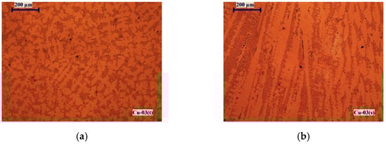 Figure 7 shows microstructures of the Cu-02 sample manufactured at a temperature of 1500 K for 15 min retention time. The presented structures are from the upper surface of the ingot (top of the ingot)-Cu-02(t) and from the surface along the depth of the ingot (transverse section)-Cu-02(s).