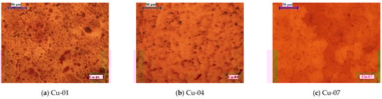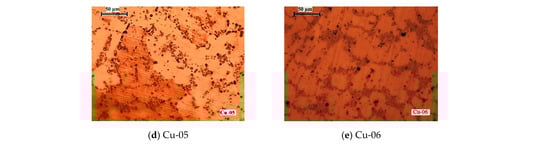 A light microscope Leica DM2500 (Leica Microsystems GmbH, Wetzlar, Germany) with a digital camera Leica EC3 (Leica Microsystems GmbH, Germany) was used for the metallographic study of the macro or micro-structure of polished and etched surfaces of copper samples. The image processing was performed using the Leica LAS software (Leica Microsystems GmbH, Germany).