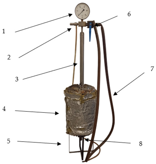 Reactor RBMT2020-1.1 used for biochar production, 1—manometer, 2—safety valve, 3—gas cooler, 4—reactor chamber wrapped by heating jacket and insulation, 5—stand, 6—upper valve, 7—exhaust gas pipe, 8—lower valve.