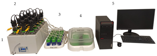 Biochemical methane potential (BMP) tests were performed using an automatic methane potential test system (BPC Instruments AB, AMPTS® II, Lund, Sweden) presented in Figure 2. The system consists of 15 reactors (500 mL) with agitation (2) placed in water batch (1), gas volume meters (4) as well as a built-in data acquisition system that can be displayed on PC (5). Due to the presence of CO2 absorption units filled with NaOH solution (4), only CH4 volume was measured.