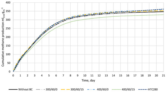 The effect of low-temperature biochar addition on the cumulative biomethane production process for 21 days was investigated (Figure 3). The result shows that the highest methane production was obtained for biochar from hydrothermal carbonization (HTC280) and biochar produced at 400/60/0. The control reactors obtained 347.9 mlCH4 × gVS−1, while reactors with biochars 400/60/0 and HTC280 had 360.1 mlCH4 × gVS−1 and 365.2 mlCH4 × gVS−1, respectively (Figure 3). The lowest value of BMP was obtained for reactors where biochar 400/60/15 was added (331.7 mlCH4 × gVS−1).
