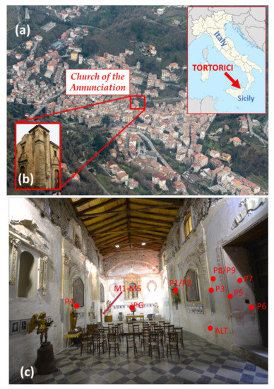 A geolocation map of the city of Tortorici, with the investigated Church, are reported in Figure 1a,b, respectively.