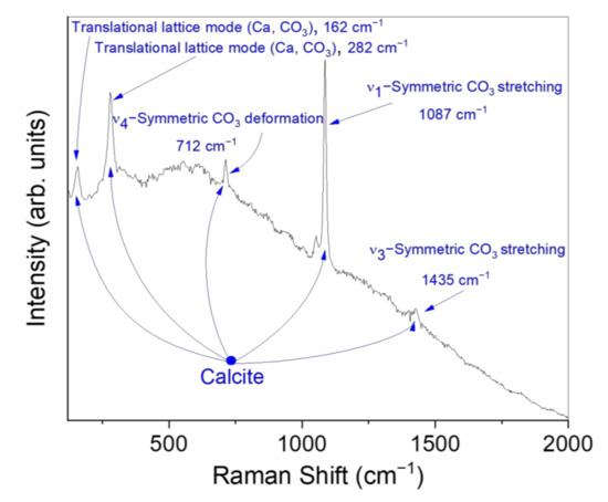 22. Rutt, H.N.; Nicola, J.H. Raman spectra of carbonates of calcite structure. J. Phys. C Solid State Phys. 1974, 7, 4522–4528. [Google Scholar] [CrossRef]